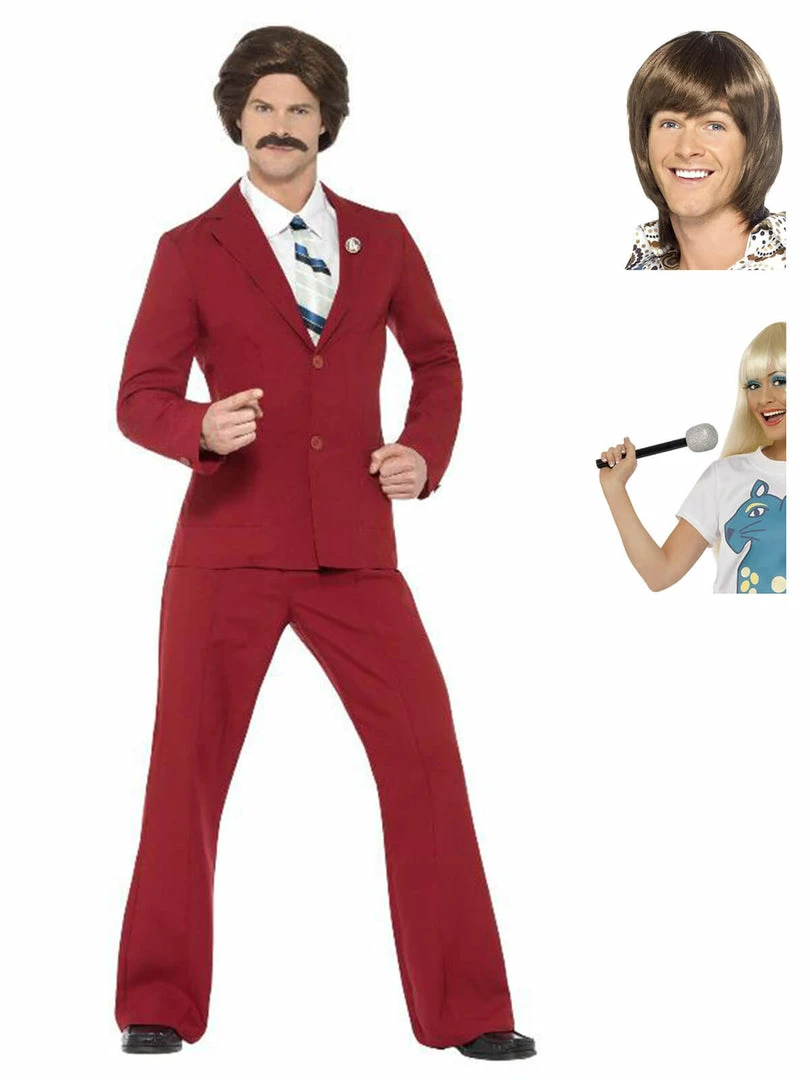 Be the anchorman himself, Ron Burgundy! This suit is complete with mock shirt, tie and moustache. Complete the look with a 70’s style wig.