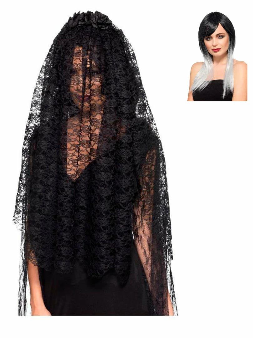 Be a Black Widow in this black widow veil. This veil hangs over the face and has black lace flowers throughout.