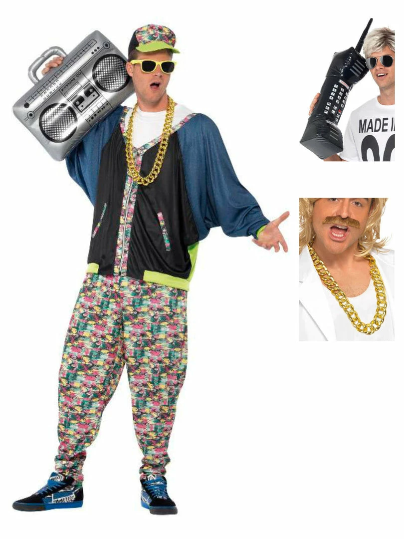 Boots ‘n Cats the night away in this 80’s hip hop costume. This 90’s attire comes with patterened jacket, trousers & hat. Complete the look with an inflatable boom box!
