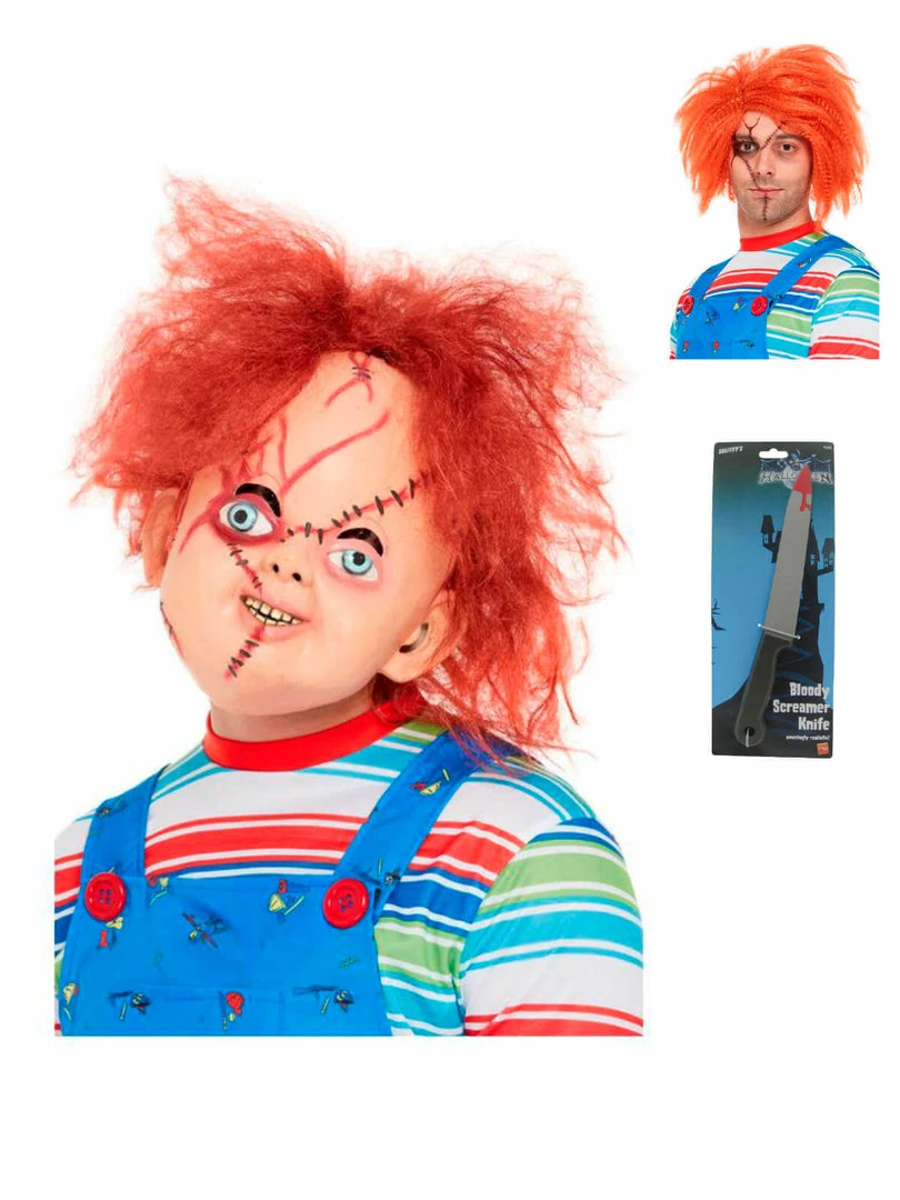 WANNA PLAY?! Complete your Chucky costume in this overhead latex mask. Mask comes red hair and stitch detail on face.