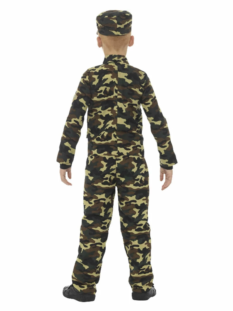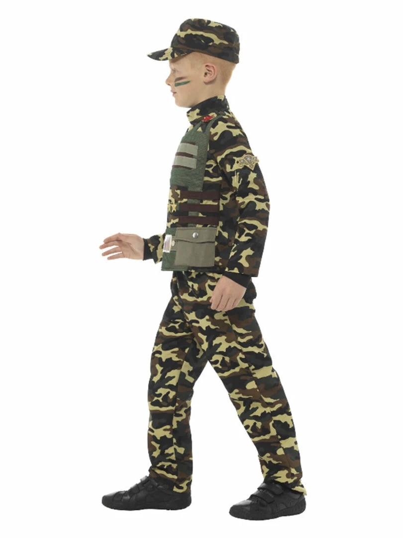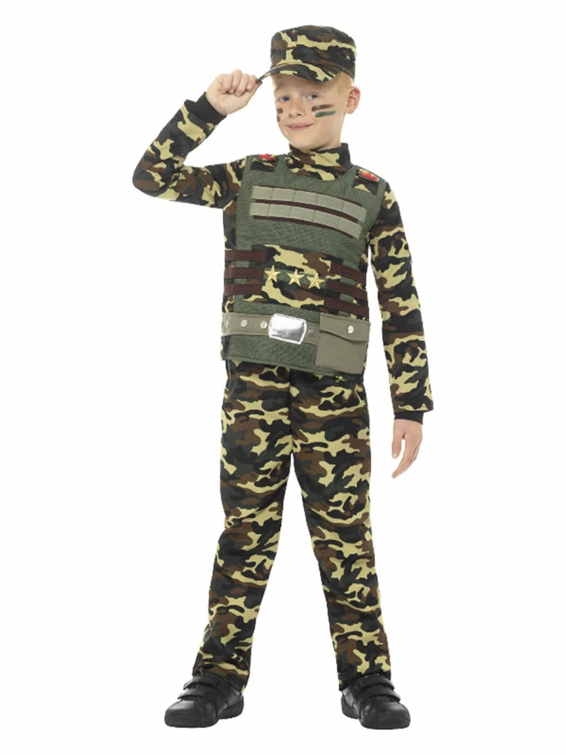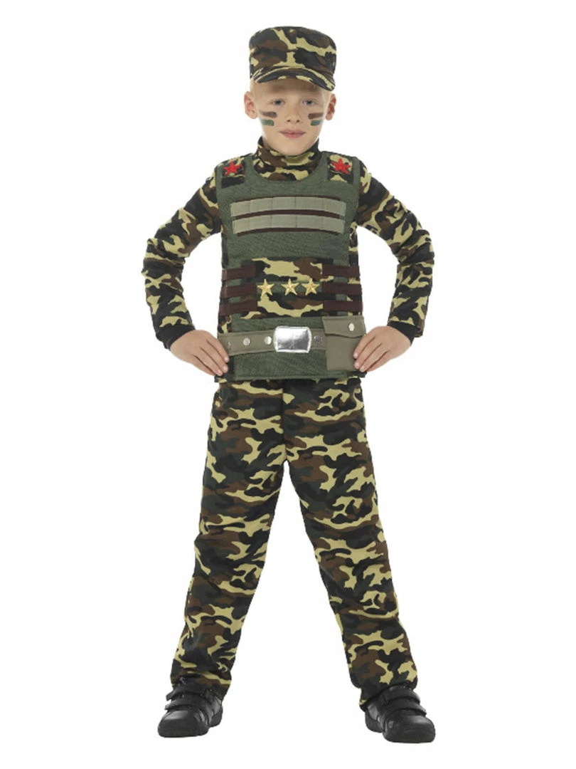 Master the art of camoflage in this military ensemble. Complete with top trousers and hat all your missing is some stripes of facepaint and you’ll be ready for action.