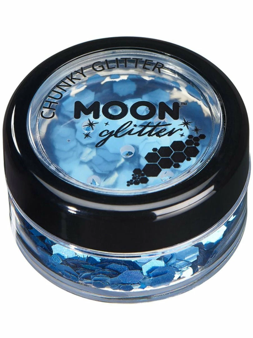 Moon Glitter. Chunky Holographic Glitter in various colours to be used on face or body. Perfect for Festivals, Clubbing, Parties, Pro beauty make up looks and face painting. Apply by putting on a base that will stick the glitter on, you can even use vaseline. Once on, you can build up colours and different sizes of glitter to get that chunky glitter festival look!