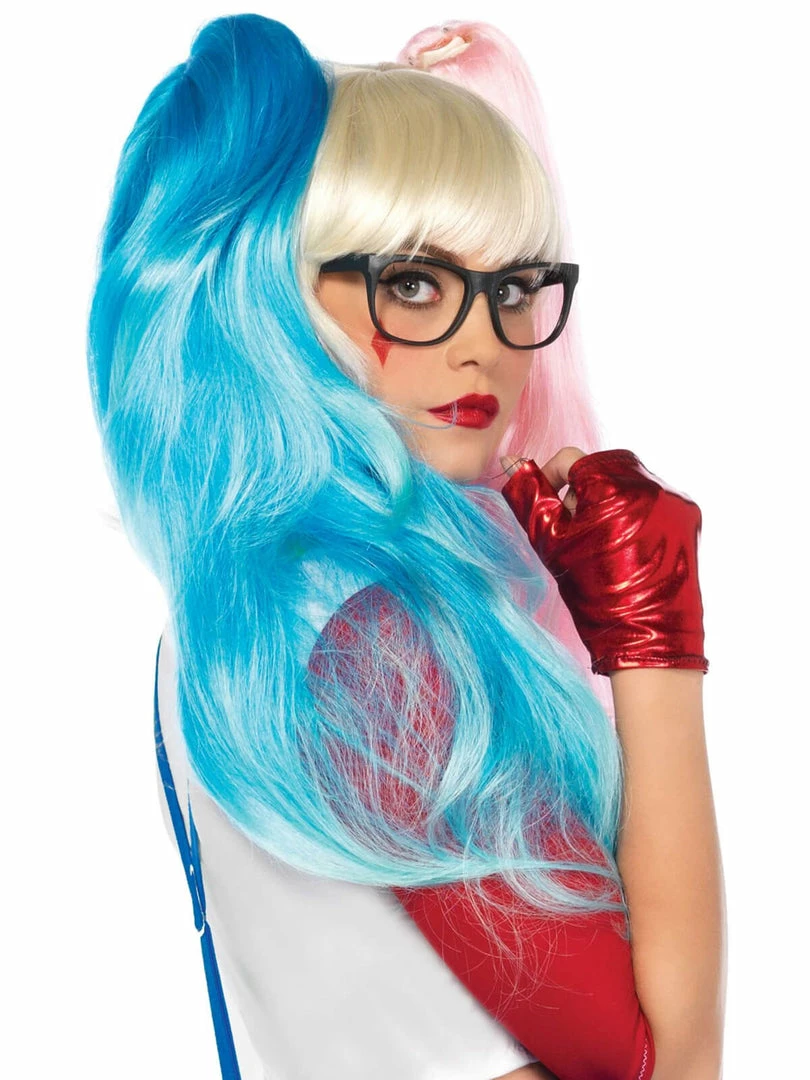 The perfect accessory for a Harley Quinn inspired cosplay this wig has an adjustable and stretchy wig cap for the perfect fit and clip on pigtails to have you ready for action.