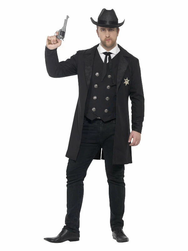 Look like the coolest Cowboy in the wild west in this sheriff costume. With a black jacket, waistcoat, neck tie and hat, simply add jeans and cowboy boots to complete your wild western look.