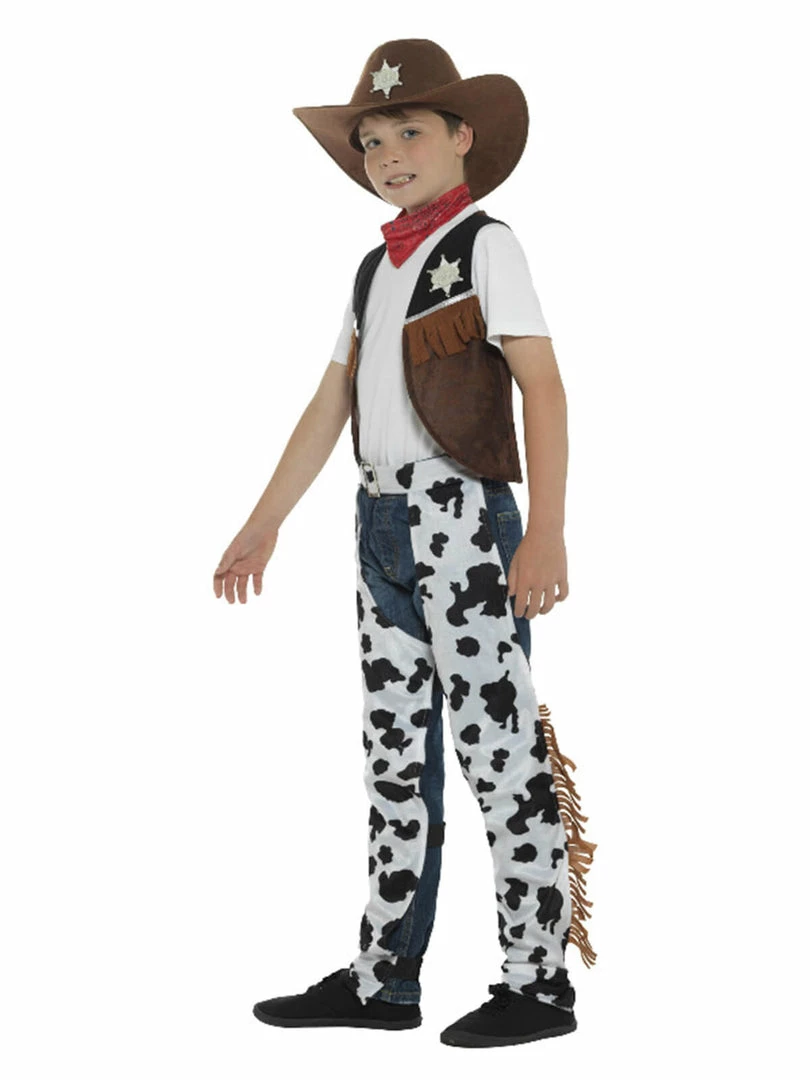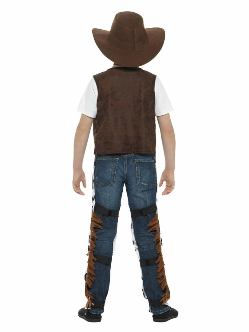 Texan Cowboy Costume, Brown with Hat, Neck Tie, Waistcoat, Badge & Chaps
