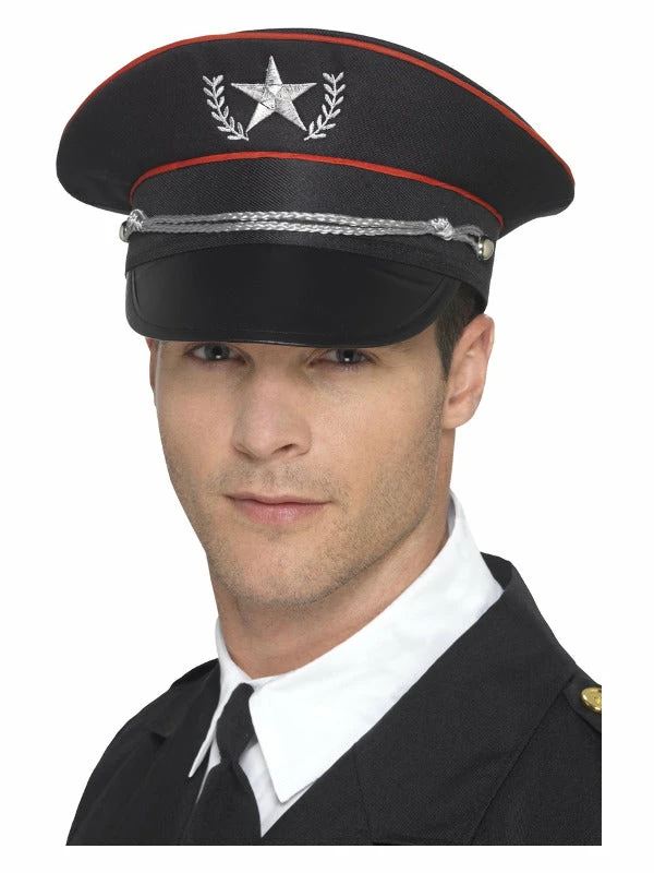 OH CAPTAIN! This deluxe military hat is black with red piping and a silver embroidered design.