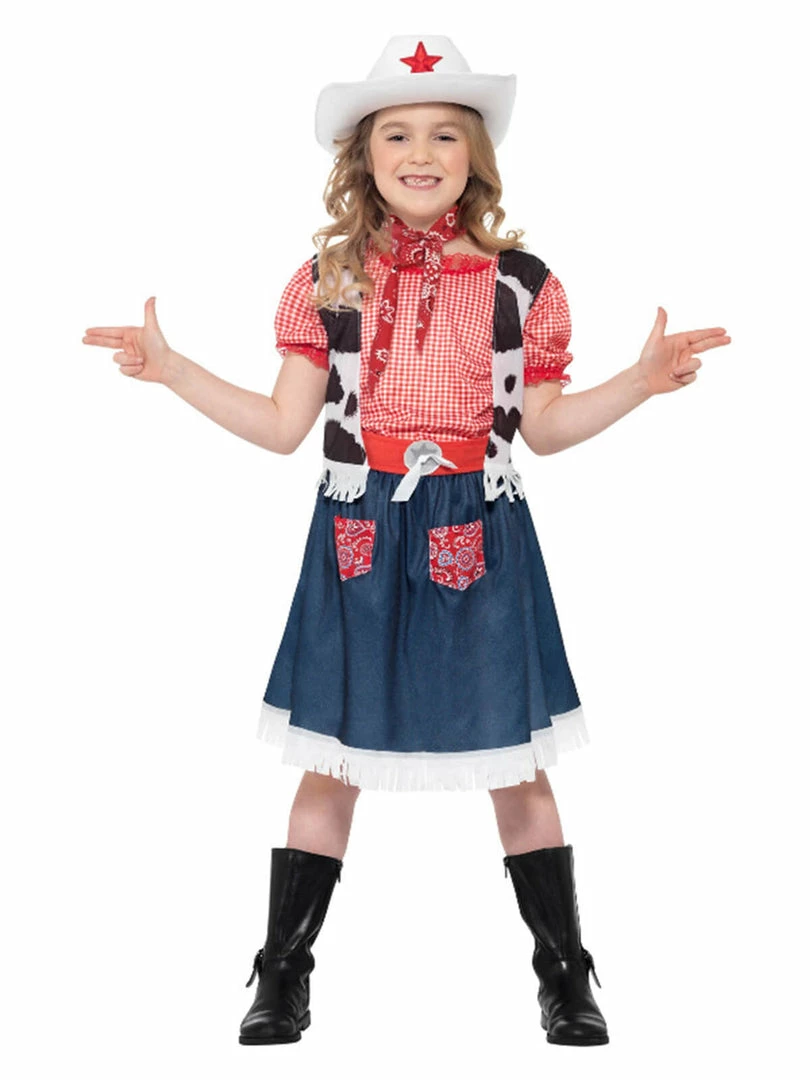YEE HAW! Become the coolest cowgirl in the wild west in this cute costume. Complete with dress, vest, belt, scarf and hat you have everything you need for the rodeo!