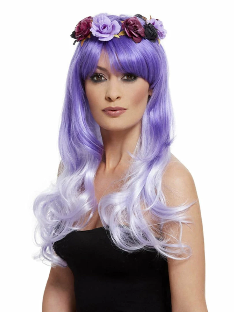 Deluxe Day of the Dead Glam Wig, Purple with Flowers