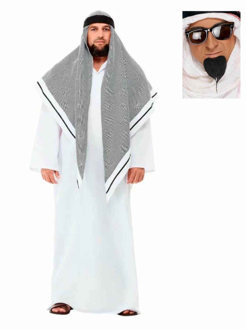 SHOW ME THE MONEY! Fancy being the richest man at the party? Well now you can look the part in this Deluxe Fake Sheikh fancy dress costume. This costume comes with a white robe and headdress. Great for an around the world themed party.