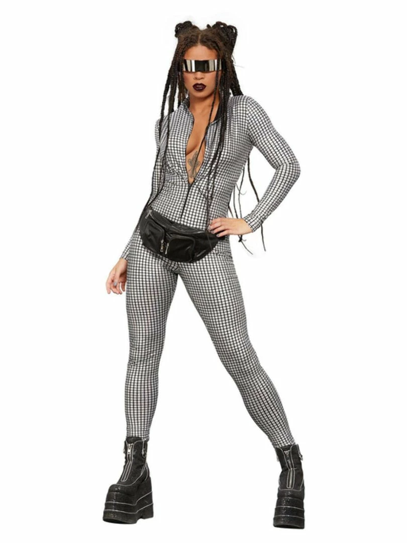 Fever Miss Whiplash Disco Holographic Costume, Zip Up Catsuit. This all in one suit will bring you through from daytime to night time at any festival. This rave look is all you need for clubbing, festivals and parties.