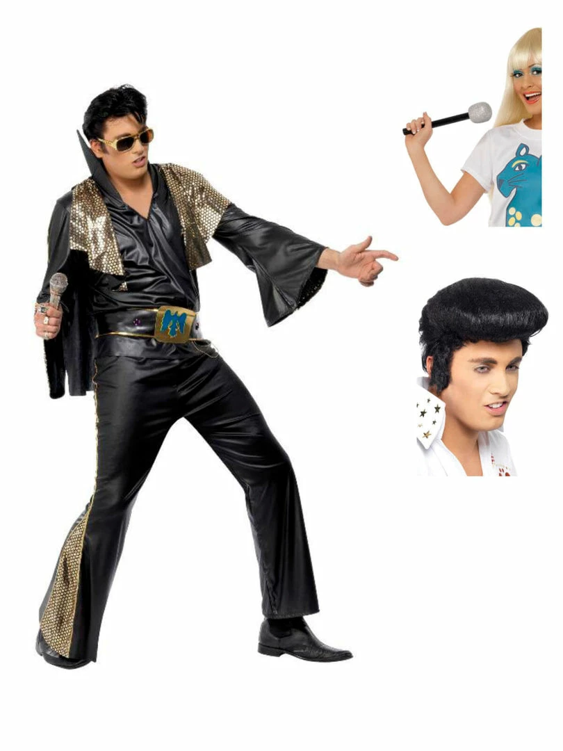 Be Elvis Himselvis in this officially licenced Elvis fancy dress Costume. You’ll be all shook up once you put on this costume which includes Black and gold shirt, trousers, cape and belt. Blue suede shoes not included!