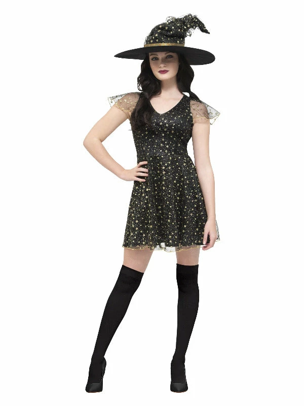This cute and sexy Witch costume comes as a short black dress with gold stars and moons on them with hat included.