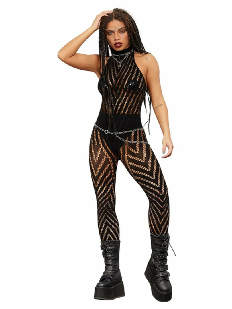 If you love festivals and clubbing, This gorgeous festival fit Fever Sleeveless V Striped Bodystocking in black is a standout statement piece for your wardrobe.