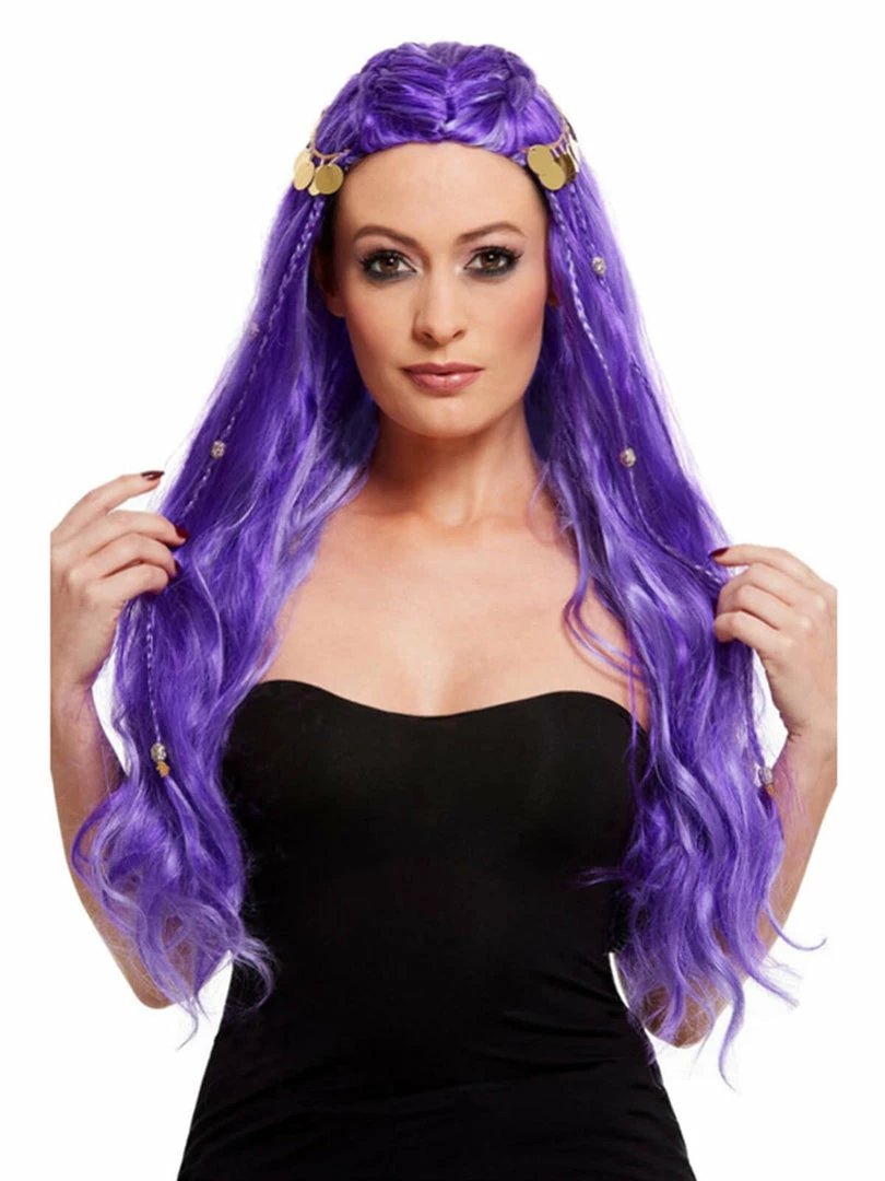 We predict you will have a good night in this purple wavy fortune teller wig. Complete with Jangly bits!