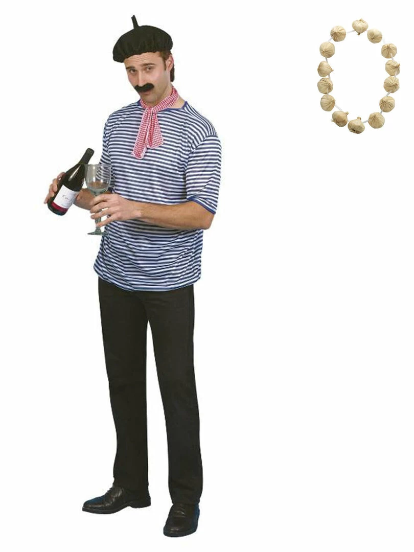 This quick and easy costume will have folk saying Oh lá lá Monesieur! This French Man Set includes a t-shirt, beret, scarf and moustache. Ideal fancy dress for men.