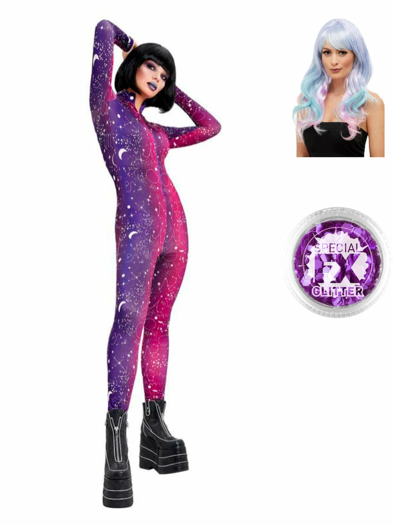 This Galactic bodysuit onesie is a beautiful purple ombre colour with all over galactic print. This costume would make a great festival or clubbing outfit as well as an alien or outer space look.