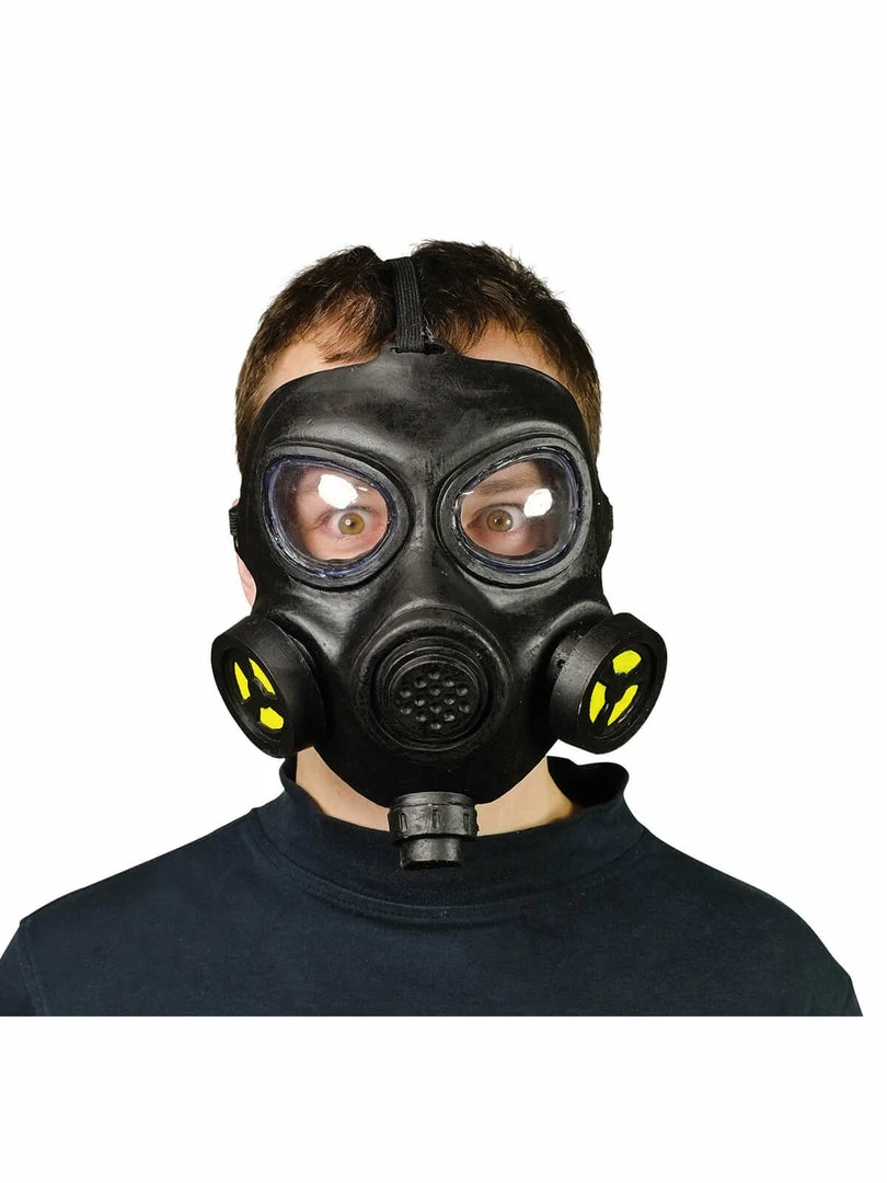 Straight out of a nuclear disaster, this gas mask will be sure to be used for many costumes time and time again. This is a Black Injection Mask with Clear Transparent Lenses. It has 2 Small Canisters in Black and Yellow.