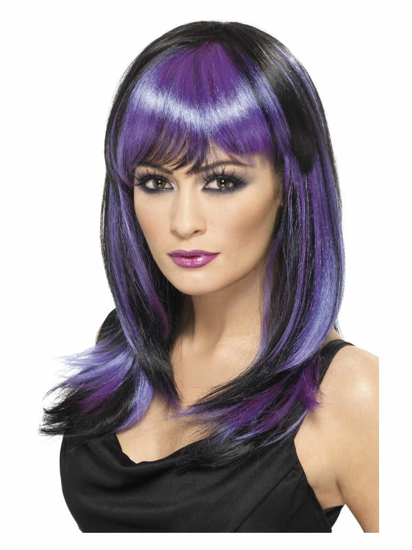 You’ll be giving people Witchty vibes all night in this striking black and purple wig, long with fringe.