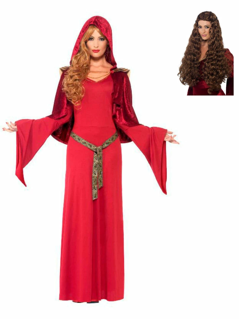 You will be worshiped when you become a high Priestess in this beautiful red floor length costume with belt and hooded cape. Complete the look with a long wig.