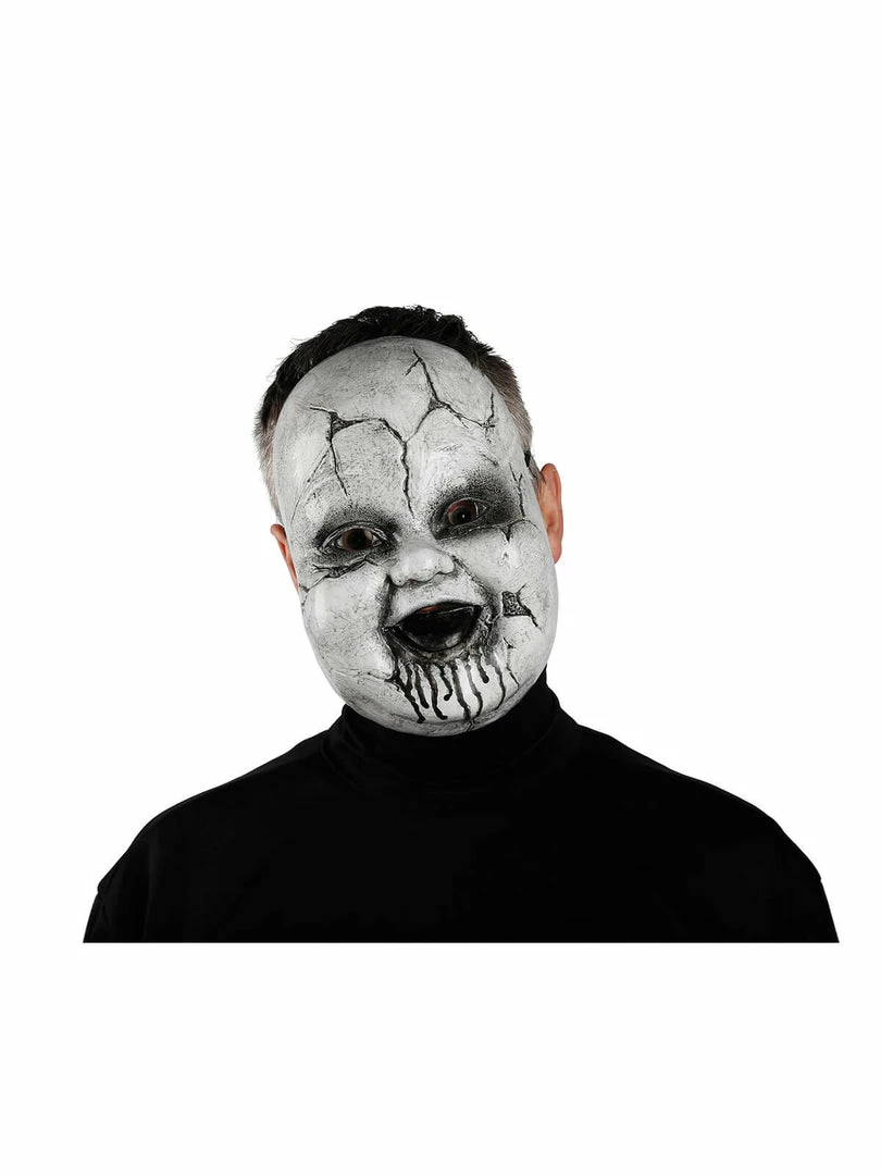 This Damien mask is a white cracked baby face mask with black eyes and black blood coming out of its mouth. Great for Halloween.