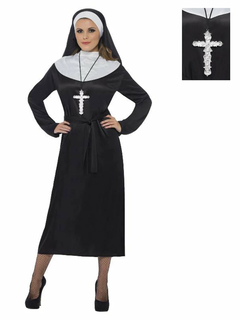 Be holier then thou in this Nun costume. Comes complete with Black dress, belt and headdress. Complete the look with a cross pendant and plenty of red wine!
