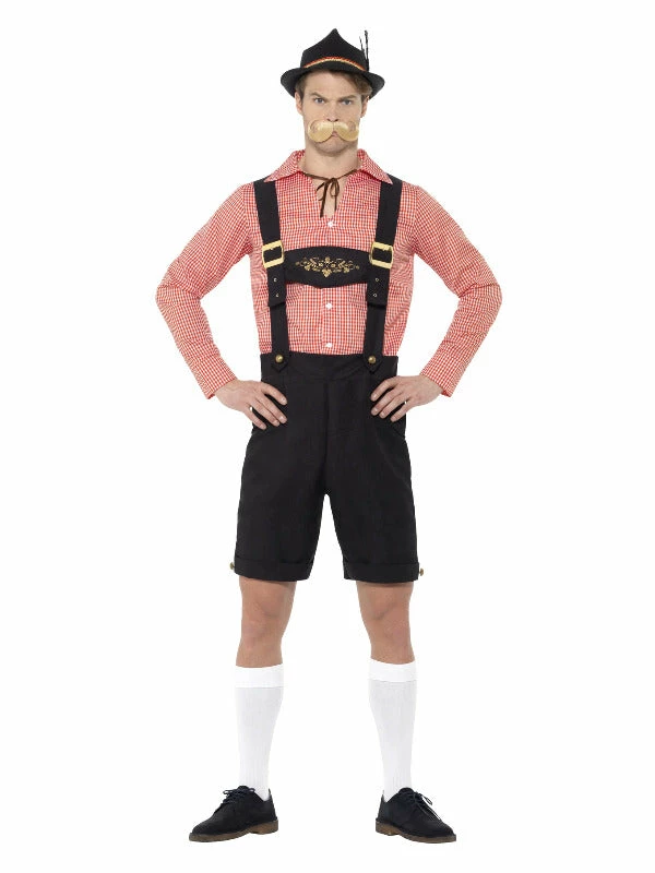 Be Oktoberfest ready in this Oktoberfest fancy dress costume. This costume comes complete with brown lederhosen and a red shirt. Accessorise with a Bavarian style hat to complete the look!.