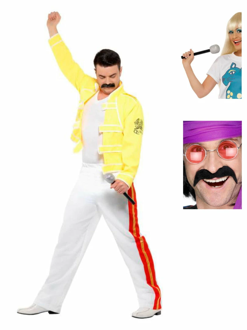 WE WILL ROCK YOU! Be the Queen himself, Freddie Mercury in this iconic fancy dress costume. Costume comes with yellow jacket and white trousers with red stripes. Complete your costume with a microphone. A great look for 80’s parties!