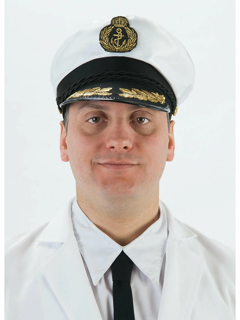 Be the captain of your own ship in this Ship Captain’s Satin Hat. White with black trim and gold applique.