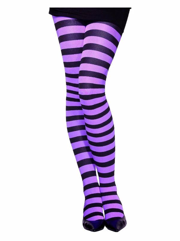 These witchy purple and black striped tights are a prefect accessory for Halloween!