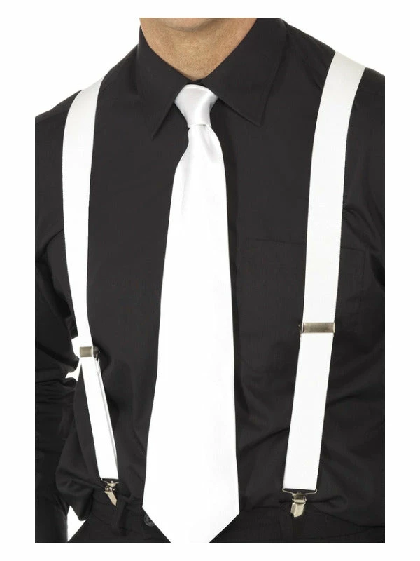 Complete your 20s razzle costume with the White elasticated braces. They come with a metal hold clip.