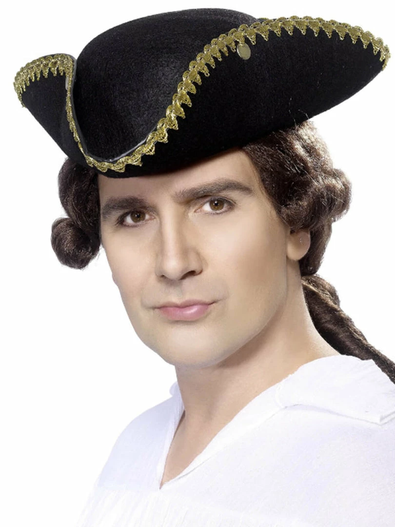A perefct Dick Turpin’s tricorn hat in black felt with deluxe gold braid decoration. Great finishing piece for both highwaymen and gentlemen pirates.